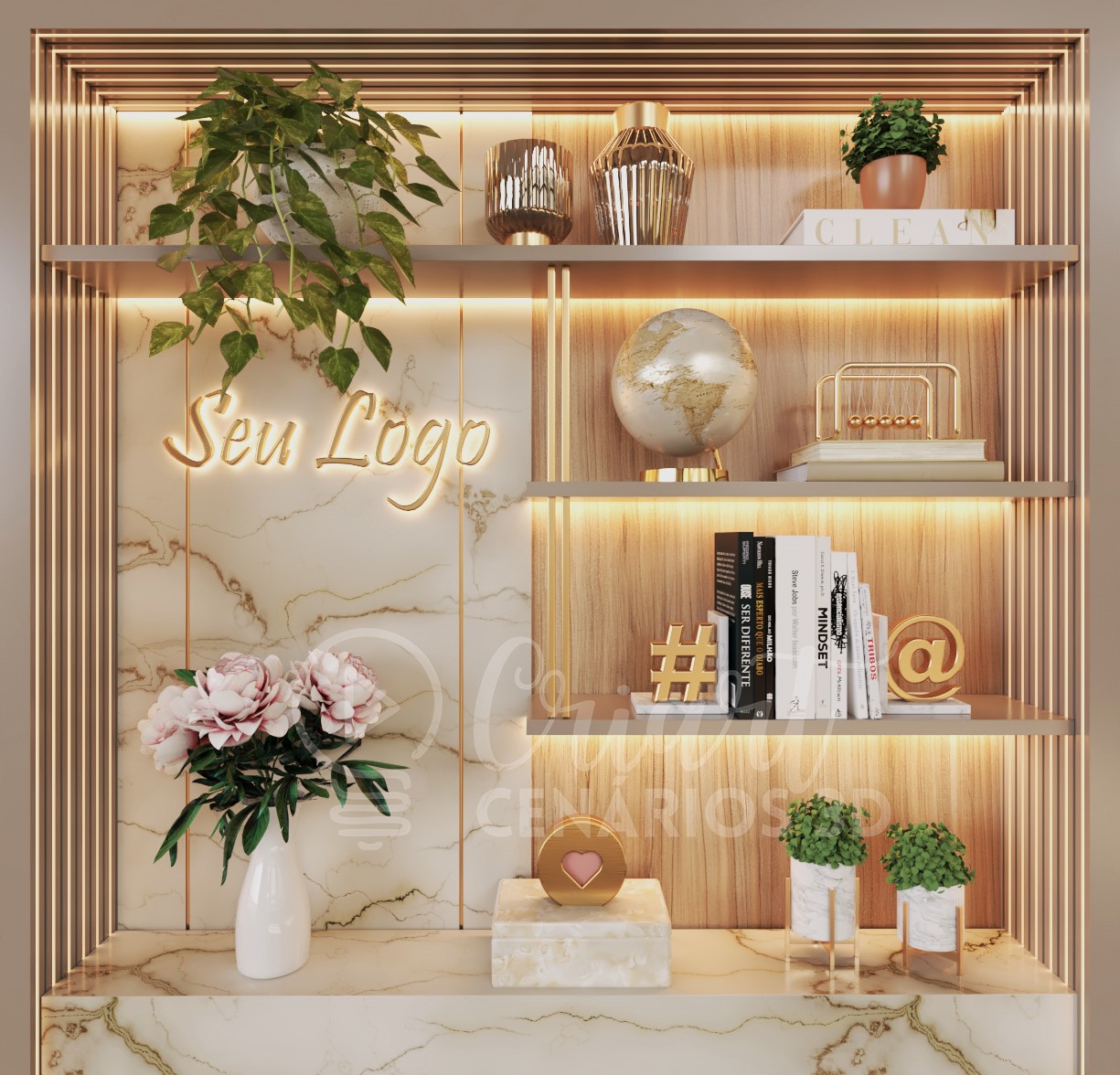 Você pode comprar a arte pronta ou fazer até 3 alterações nos objetos decorativos sem custo adicional .Aproveita para incluir teu logo, fotos, livros, objetos referentes ao teu nicho e até frases!