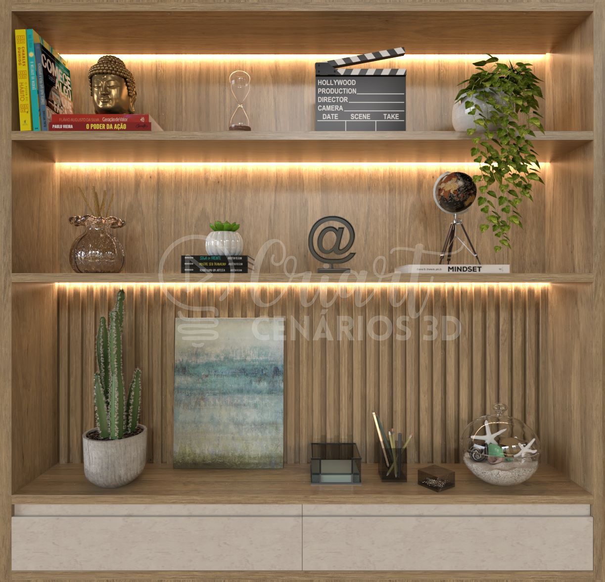Você pode comprar a arte pronta ou fazer até 3 alterações nos objetos decorativos sem custo adicional .Aproveita para incluir teu logo, fotos, livros, objetos referentes ao teu nicho e até frases!