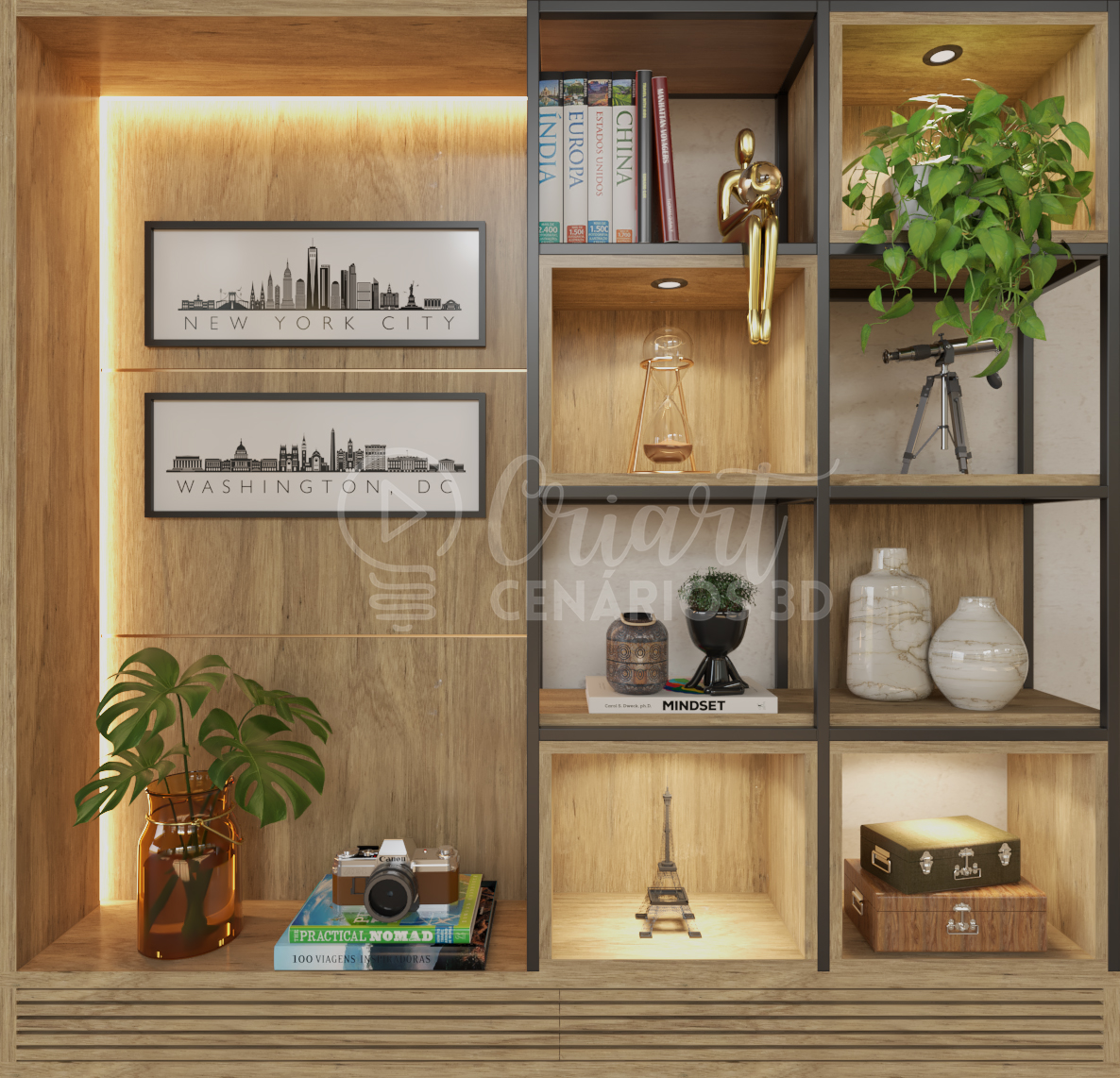 Você pode comprar a arte pronta ou fazer até 3 alterações nos objetos decorativos sem custo adicional .Aproveita para incluir teu logo, fotos, livros, objetos referentes ao teu nicho e até frases!