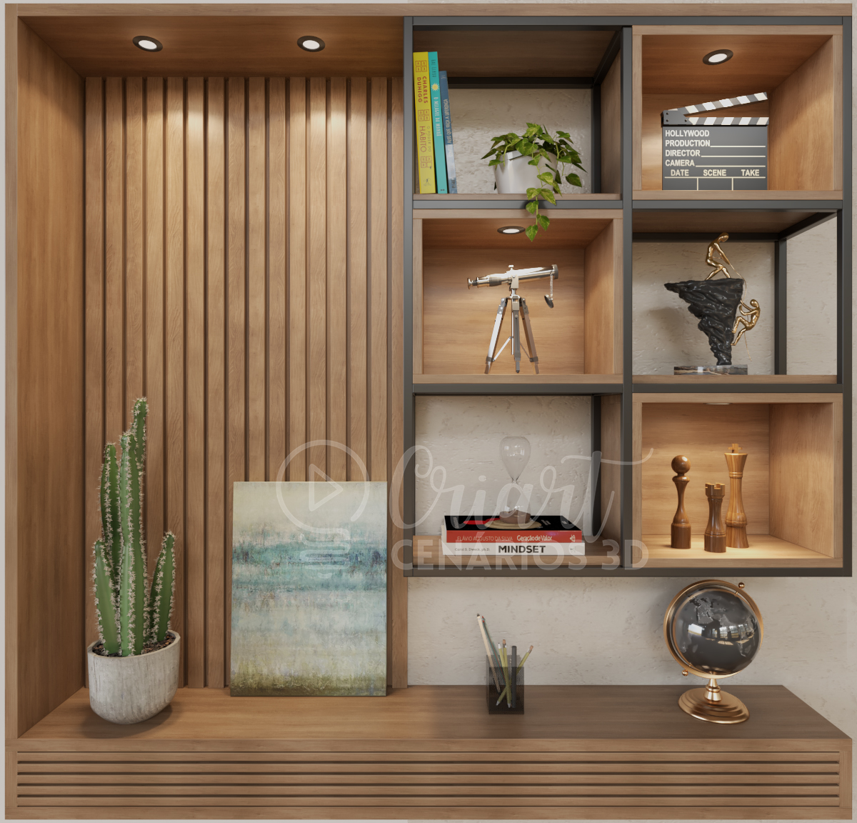 Você pode comprar a arte pronta ou fazer até 3 alterações nos objetos decorativos sem custo adicional .Aproveita para incluir teu logo, fotos, livros, objetos referentes ao teu nicho e até frases!